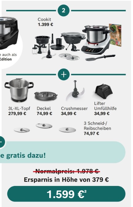 | Angebot 2 | 1.599 € | Großes Zubehörpaket inkl. XL-Topf | Maximale Ausstattung & hohe Ersparnis |